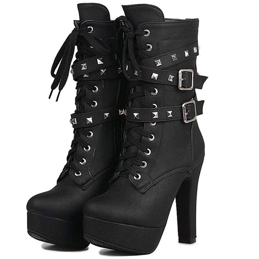 Women Autumn Round Toe Lace Up Ankle Buckle Chunky High Heel Platform Knight Boots (Black2, 7.5)�
